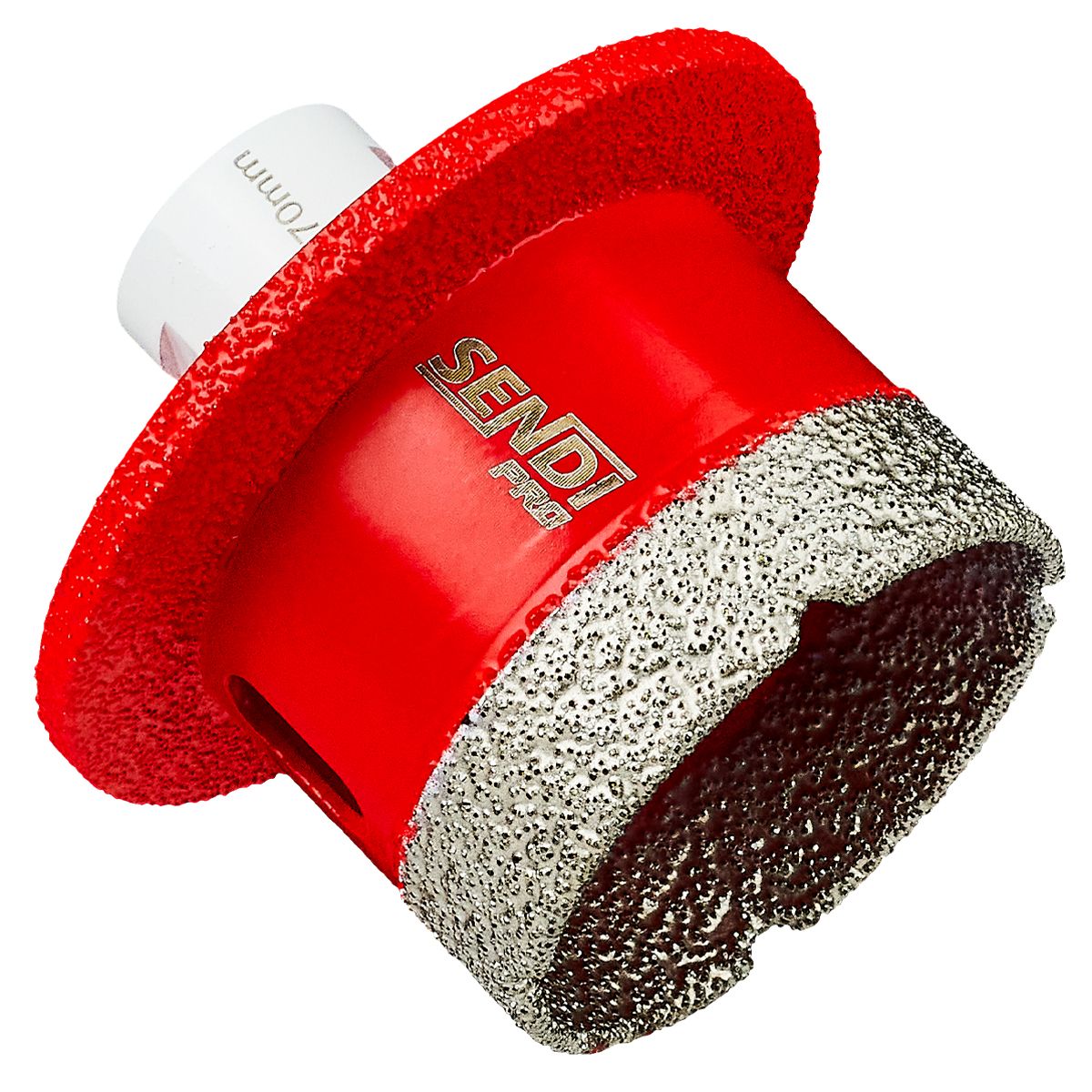 Profesjonalna otwornica diamentowa SENDI PRO 50-70 mm przeznaczona do wykonywania otworów z frezowaniem w umywalkach i zlewach z kamienia naturalnego, ceramiki i gresu. Koronka wykonana w technologii lutowania próżniowego umożliwia szybsze wiercenie w twardych materiałach, cechuje się lepszą odpornością na przegrzewanie oraz zapewnia dłuższą żywotność. Wiertło z mocowaniem M14 na szlifierki kątowe, do pracy głównie na sucho.