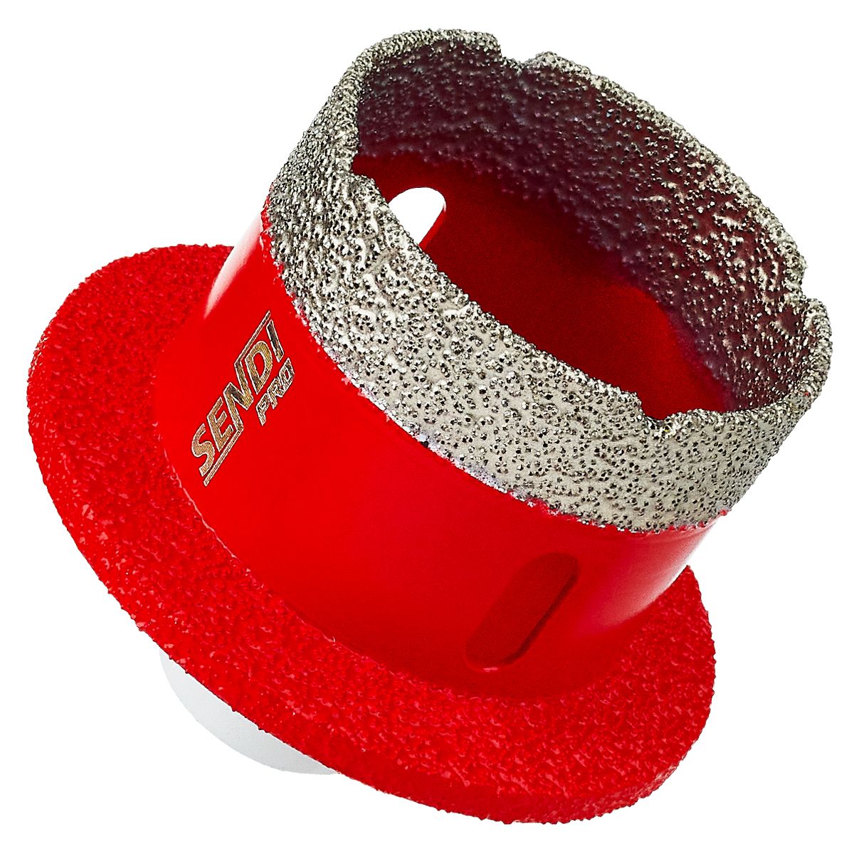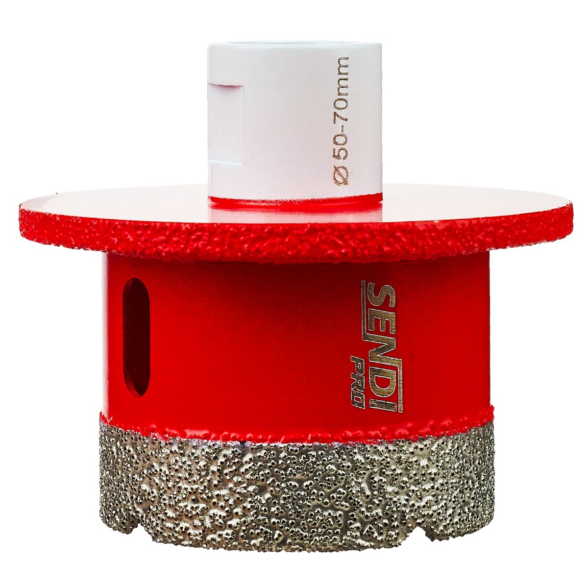 Profesjonalna otwornica diamentowa SENDI PRO 50-70 mm przeznaczona do wykonywania otworów z frezowaniem w umywalkach i zlewach z kamienia naturalnego, ceramiki i gresu.